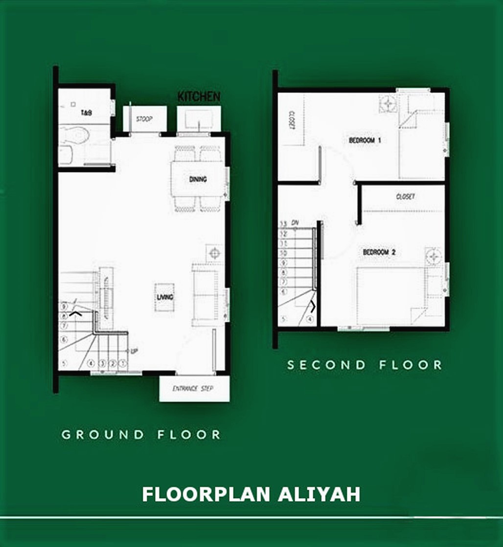Aliyah has a lot area of 80 and a house area of 46 sqm. It's a single attached house with two bedrooms, one toilet and bath, a living area, dining area, kitchen, a carport, and a laundr/service area.